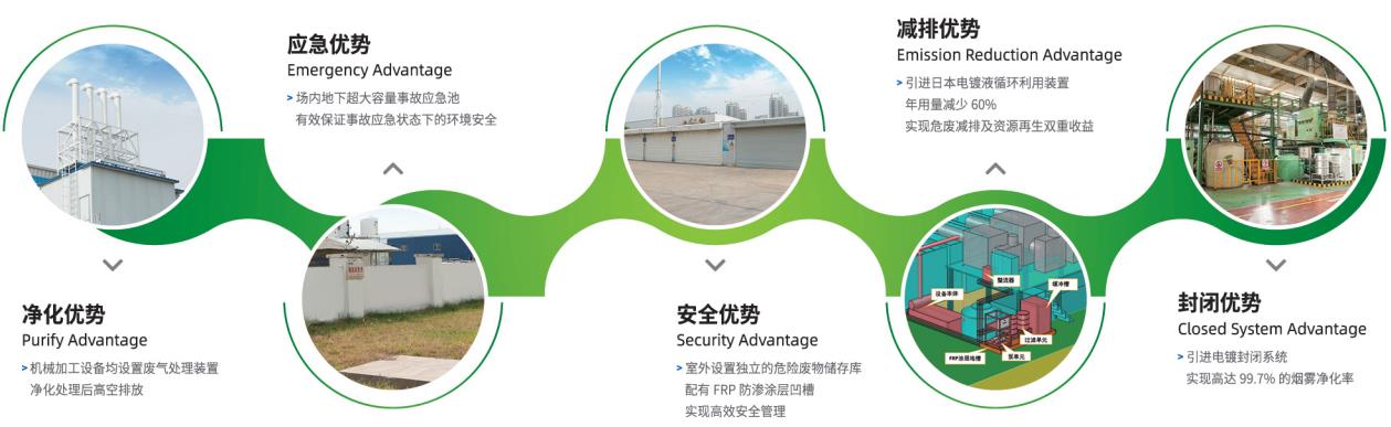 減排優(yōu)勢(shì)Emission Reduction Advantage>引進(jìn)日本電鍍液循環(huán)利用裝置年用量減少60%實(shí)現(xiàn)危廢減排及資源再生雙重收益;封閉優(yōu)勢(shì)Closed System Advantage>引進(jìn)電鍍封閉系統(tǒng)實(shí)現(xiàn)高達(dá)99. 7%的煙霧凈化率。