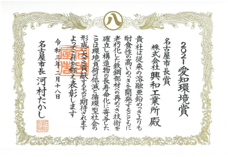 興和(山東)機(jī)械有限公司的日本本社株式會(huì)社興和工業(yè)所于2021年2月18日榮獲2021年度愛(ài)知縣環(huán)境保護(hù)獎(jiǎng)。茲用來(lái)表彰株式會(huì)社興和工業(yè)所不同于一般的鍍鋅工藝,在研發(fā)使用高耐腐蝕性電鍍技術(shù)的同時(shí),通過(guò)對(duì)老化鋼材的再電鍍技術(shù),實(shí)現(xiàn)了構(gòu)造物壽命的延長(zhǎng),對(duì)環(huán)境保護(hù)及構(gòu)建循環(huán)型社會(huì)做出了重大貢獻(xiàn)。