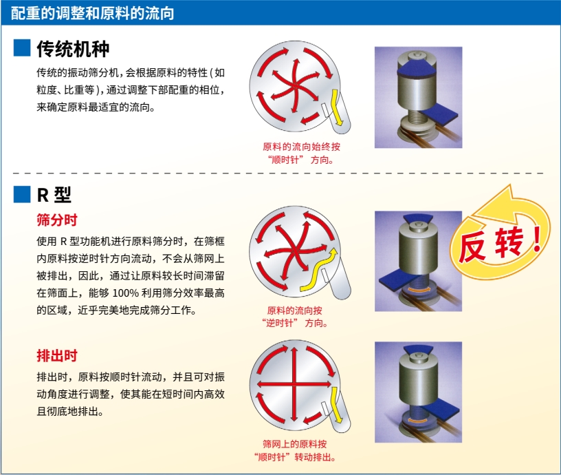 傳統(tǒng)的振動篩分機,是通過調(diào)整振動體下部配重的相位,來控制原料的流動位置。