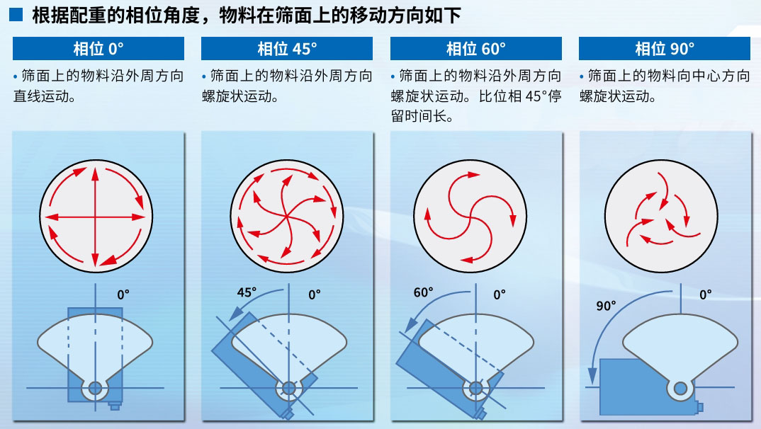 篩分的基本原理是通過振動篩網(wǎng),以實現(xiàn)對物料進行粒度大小分類或去除異物。 振動篩分機的運動原理是通過電機及振動體產(chǎn)生水平、垂直和傾斜運動,從而有效地篩分篩網(wǎng)上的物料。 此外,通過調(diào)整安裝在振動體上的配重的相位,能夠?qū)Y面上原料的流動狀態(tài)進行控制,從而可根據(jù)篩分原料的特性(粒度、比重等)實現(xiàn)篩分。