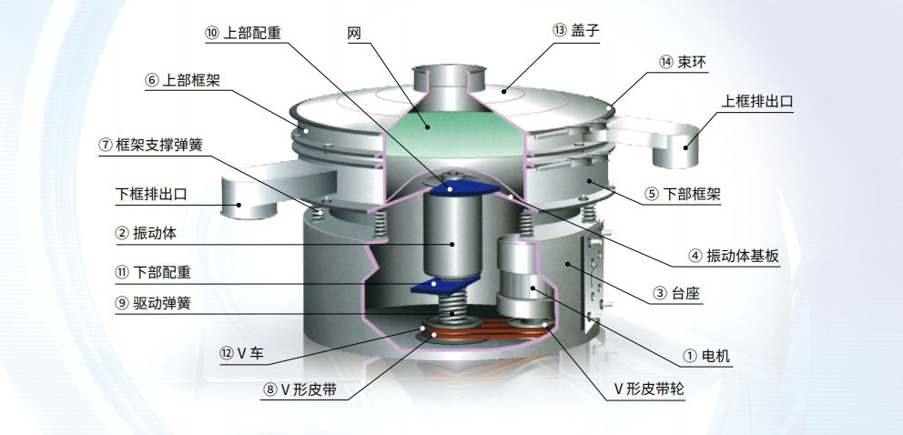 振動體與一般的圓形振動篩分機不同,它采用通用電機,通過驅(qū)動簡單的聯(lián)軸器和堅固的振動發(fā)生結(jié)構(gòu),
